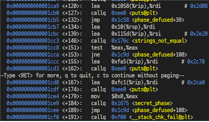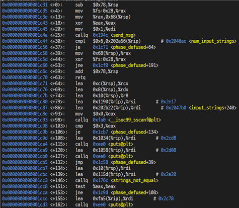disas phase_defused 명령어로 어셈블리어를 조사하자.