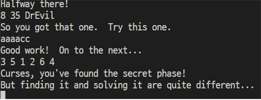 정수 두 개를 입력받는 단계인 phase_4에서 DrEvil 문자열을 추가로 입력해주자.