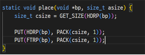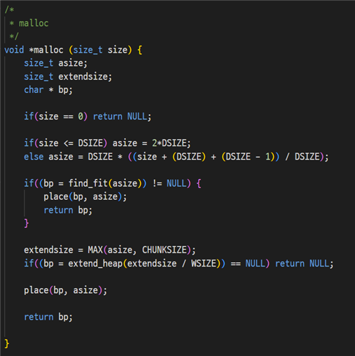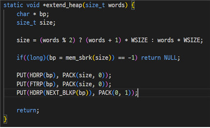 적절한 공간을 찾았으면 place 함수로 바로 공간을 할당해 주면 되지만, 찾지 못한 경우 위에서 정의한 extend_heap 함수를 호출해 힙의 크기를 늘린 후 place 함수를 호출한다.