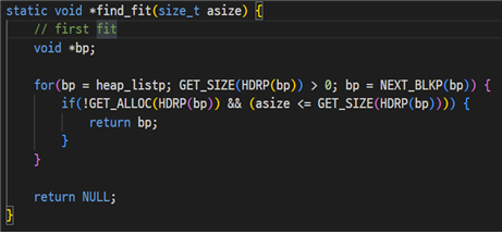 할당할 가용 블록이 가용 리스트에 있는지 확인하는데, 이 때 find_fit 함수를 사용한다.