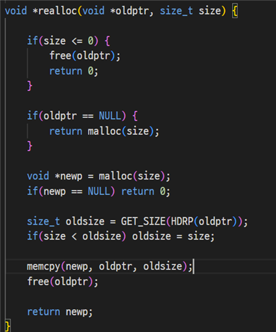 인자로 받은 크기의 블록을 만든 후 C 라이브러리의 memcpy 함수를 통해 기존 블록의 내용을 새로 만든 블록에 옮긴 후 새로운 블록을 반환하는 방식으로 작동한다.