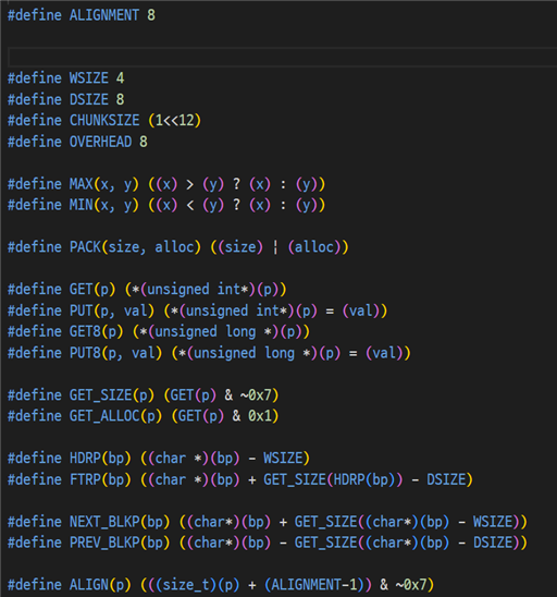 매크로는 위와 같이 설정되어있다. 이제 단계별로 implicit 방식의 malloc lab을 구현해보자.