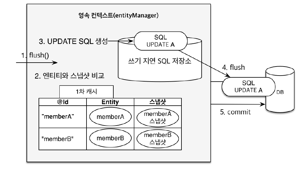 비교해서 스냅샷과 엔티티 값이 다른 경우 업데이트 sql을 생성해 쓰기 지연 sql 저장소에 저장한다.