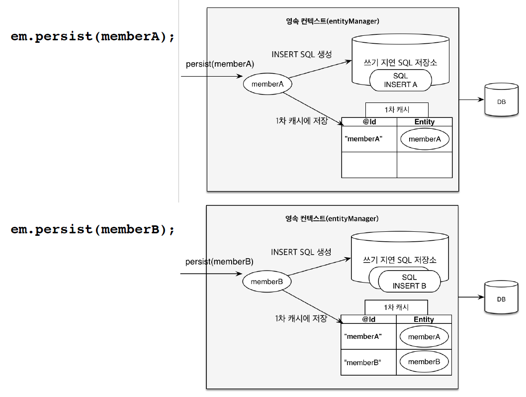 em.persist(memberB) 를 실행하면 1차 캐시에 값이 저장됨과 동시에 JPA가 엔티티를 분석해 insert 쿼리를 생성한다.