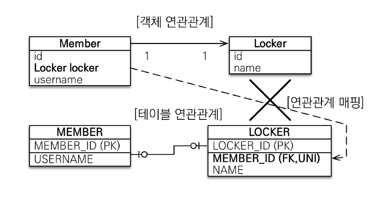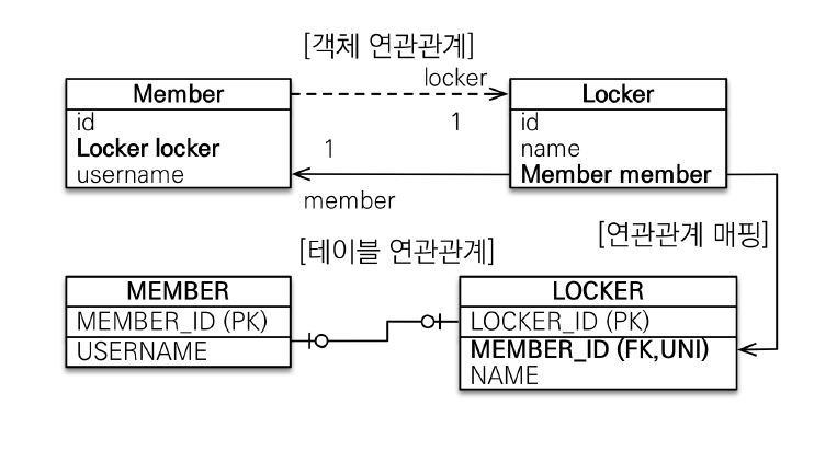 Member를 주 테이블로 생각하고 주 테이블에 외래 키를 넣은 일대일 관계이다.