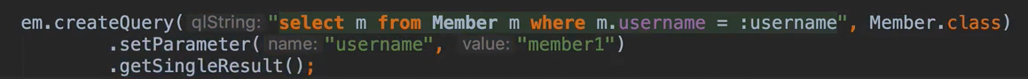 JPQL의 파라미터 바인딩은 : 를 사용해서 수행한다.