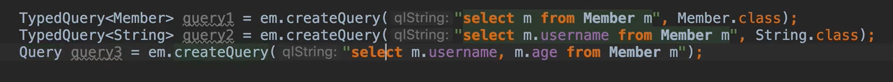 반환 타입이 명확한 경우 TypedQuery와 제네릭스를 함께 사용하고, query3처럼 반환 타입이 명확하지 않은 경우 Query를 사용해 쿼리를 저장할 수 있다.