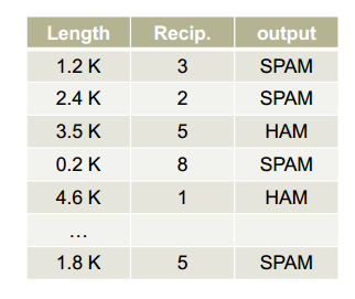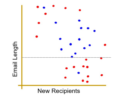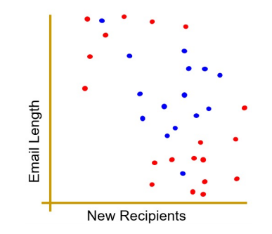 학습 데이터로 이메일을 받고, 자질로 길이, 수신자 수를 받는다.