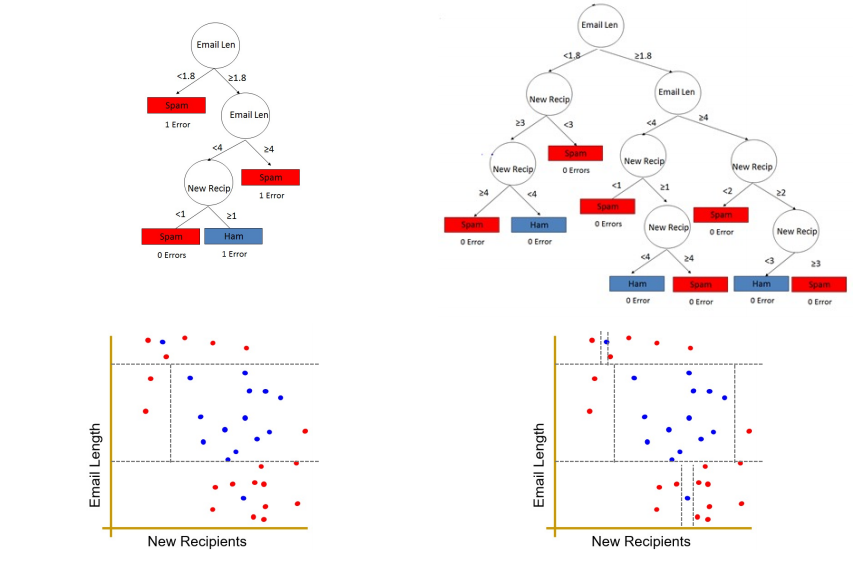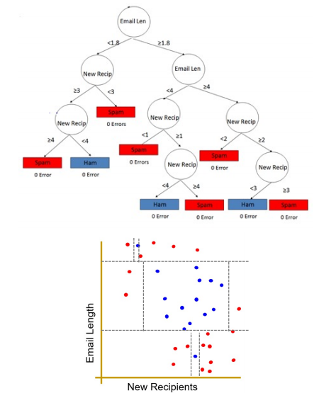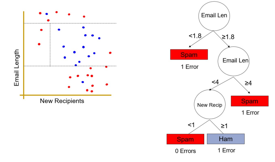 이렇게 연속되는 질문들을 통해 boundary를 좁혀가며 스팸 메일을 구분하는 Decision Tree를 완성시킨다.