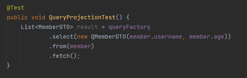 DTO를 정의할 때 생성자에 @QueryProjection 애너테이션을 붙이면 QueryDSL은 엔티티처럼 Q + DTO 객체를 만든다.