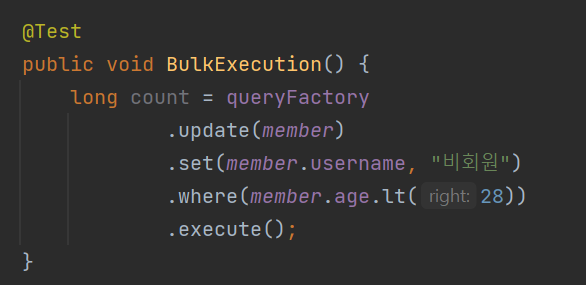 JPA를 공부할 때 확인했듯 벌크 연산을 사용하면 영속성 컨텍스트와 데이터베이스의 값이 일치하지 않게 되는 현상이 발생할 수 있으니 em.flush와 em.clear를 적절히 호출해주자.