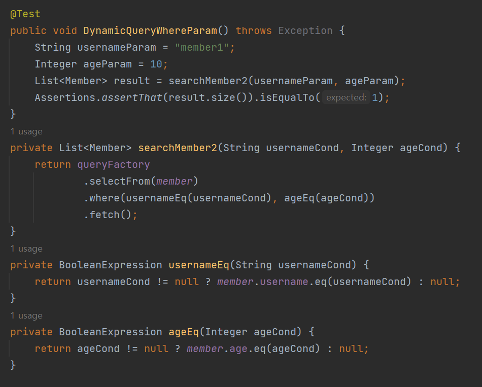 Predicate 또는 BooleanExpression 객체를 반환타입으로 설정하고, where 조건에 null 값은 무시되니 null 처리를 적절하게 사용해주자. (여러 메서드를 조합해서 쿼리를 작성할 때는 BooleanExpression을 사용해야 한다)