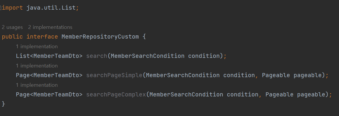 MemberRepositoryCustom을 인터페이스로 만들고 구현할 기능을 선언한 후 MemerRepositoryImpl에 기능을 구현한다.