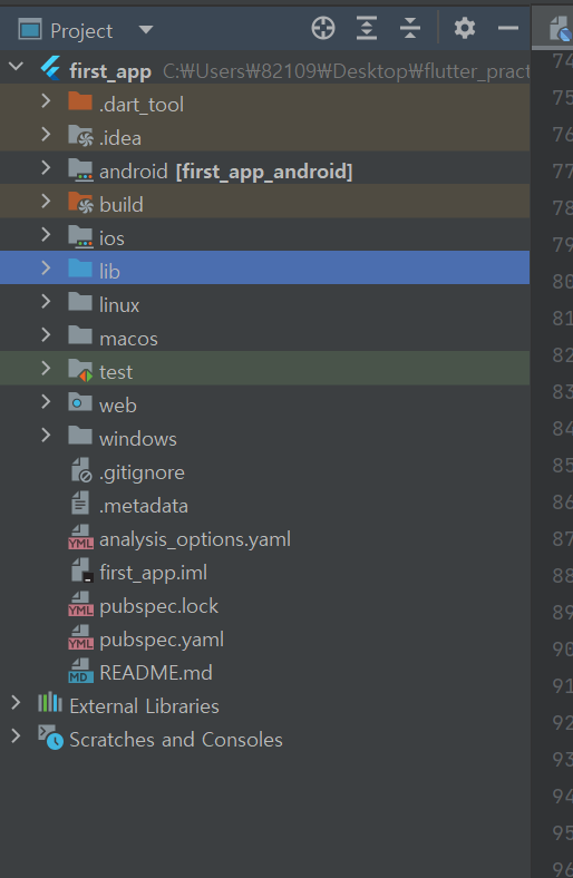 lib : 다트 소스코드가 저장된다. 스프링의 src 디렉토리와 같은 역할을 한다.