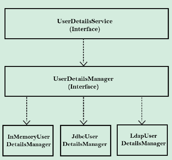 loadUserByUsername 메서드 하나만 있는 인터페이스로 해당 인터페이스를 상속받는 인터페이스로는 UserDetailsManager가 있다. (보안을 위해 비밀번호 관련 메서드는 제공하지 않는다)