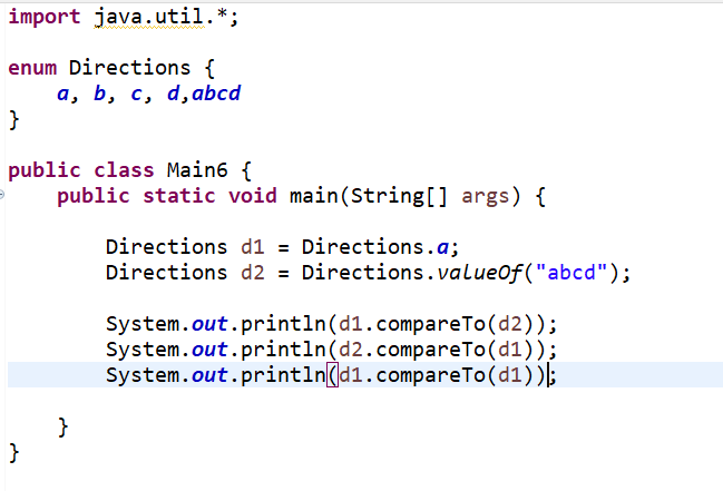 다만, < 와 > 같은 비교 연산자는 사용할 수 없는데, 대신 compareTo()메서드를 이용해 열거형 상수들을 비교할 수 있다.