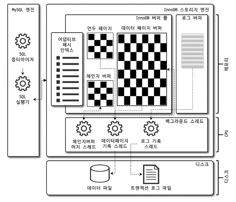 위 그림은 스토리지 엔진 중 가장 많이 사용되는 InnoDB 스토리지 엔진의 구조이다.
