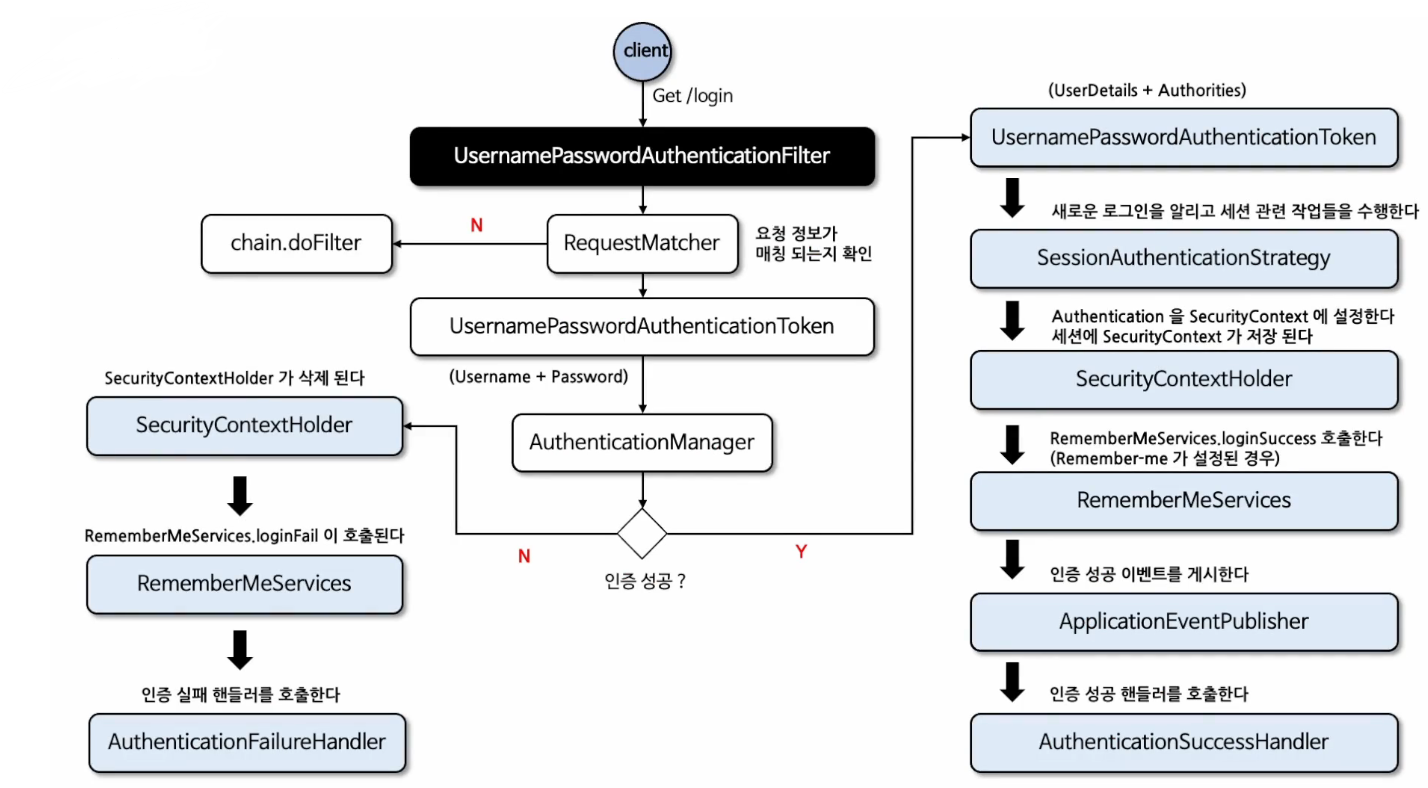 스프링 시큐리티가 기본적으로 제공하는 UsernamePasswordAuthenticationFilter 의 프로세스를 살펴보자.