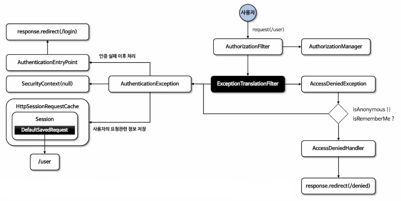 사용자의 요청이 인증이 필요한 요청이지만 인증되지 않은 상태인 경우 AuthorizationFilter는 인가 예외를 뱉고, ExceptionTranslationFilter가 처리한다.