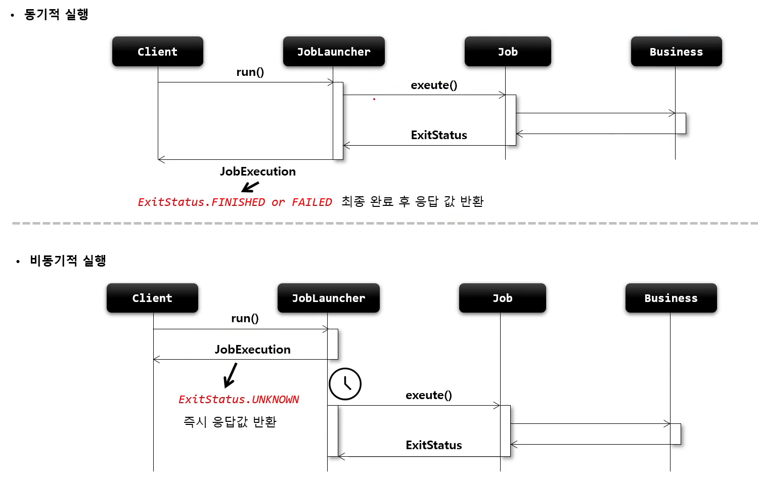 동기적 실행은 배치 작업이 완료될 때 까지 클라이언트에게 JobExecution을 반환하지 않아 스케쥴러를 통해 실행할 때 적합하고,