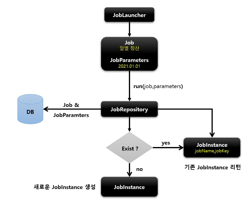 JobRepository는 DB로부터 현재 실행 중인 작업이 이전에 실행된 적이 있는지 확인하고, 이미 실행된 적이 있는 작업인 경우 기존에 실행된 JobInstance를 반환한다.