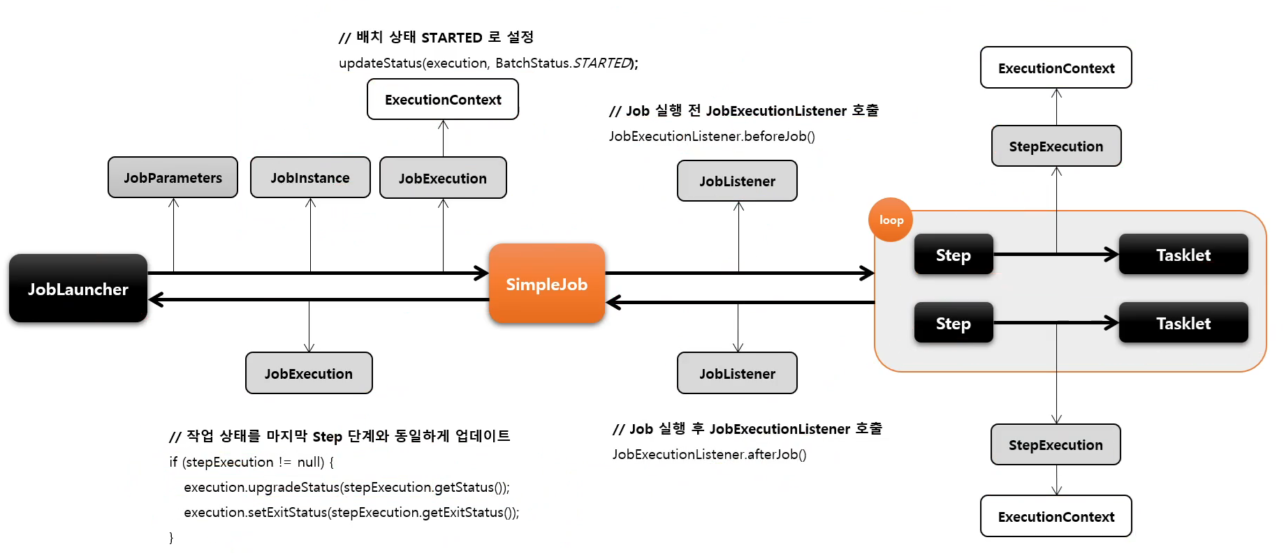 SimpleJob은 Job을 정의하고 Step을 실행시키는데, Job 실행 전후에 JobListener를 확인해 리스너에 등록된 작업을 처리한다.