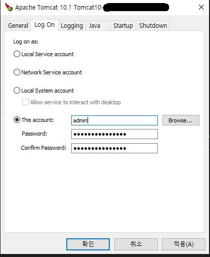 Tomcat GUI 에서도 접근하려는 네트워크 드라이브에 대한 권한이 있는 계정을 설정하고, 서비스 콘솔에서도 적절한 계정을 설정해주자.