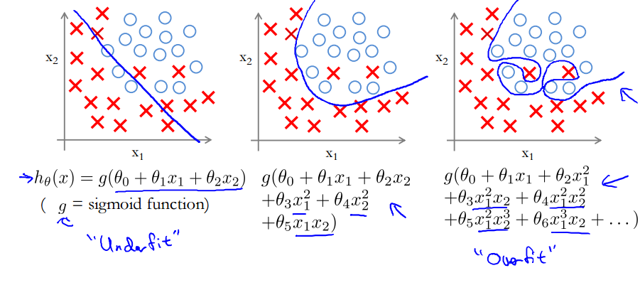 첫 번째 모델에서는 Underfit 문제가 발생하고, 세 번째 모델에서는 Overfit 문제가 발생한다.