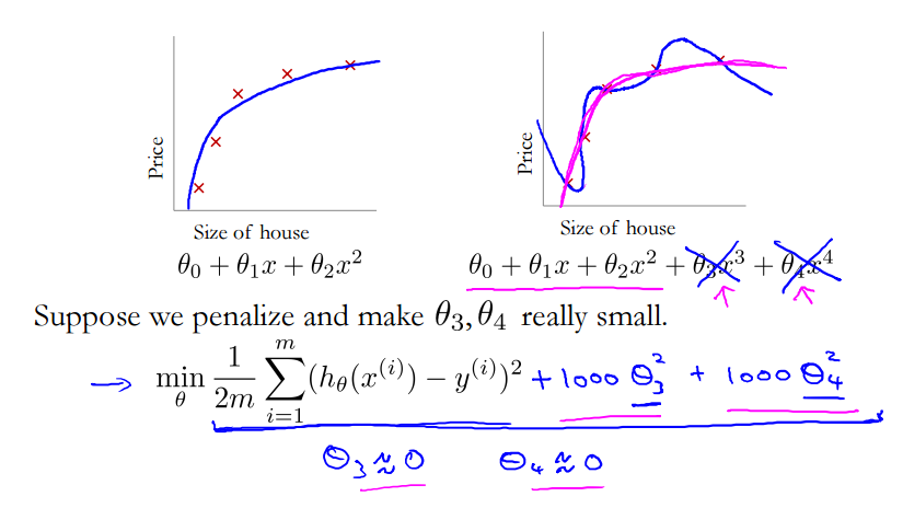 일단 먼저 모델을 복잡하게 4차로 설정한다. 그러면 2번째 모델의 파란 곡선처럼 Overfitting문제가 발생한다.
