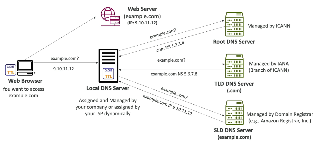 먼저 로컬 DNS 서버를 확인하고, Root DNS 서버부터 시작해 내려오면서 목적지를 찾고 로컬 DNS 서버에 캐싱한다.