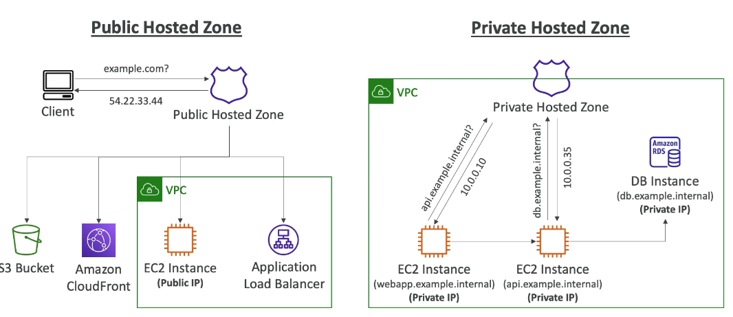 Hosted Zone이 NS 레코드를 포함하는 관계이고 Hosted Zone은 Public과 Private으로 나눠서 관리된다.