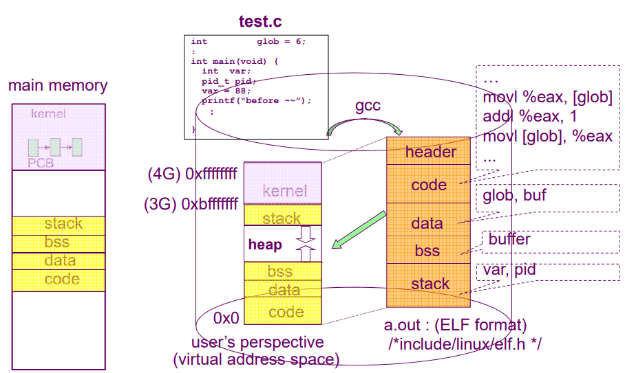 Virtual Address Space의 커널은 실제로 디스크에 존재하는 커널이 아니다. 실제 커널은 메인 메모리에만 있고, 가상메모리의 공간은 실제 메모리의 커널 데이터를 가리키고 있다고 생각하면 된다.