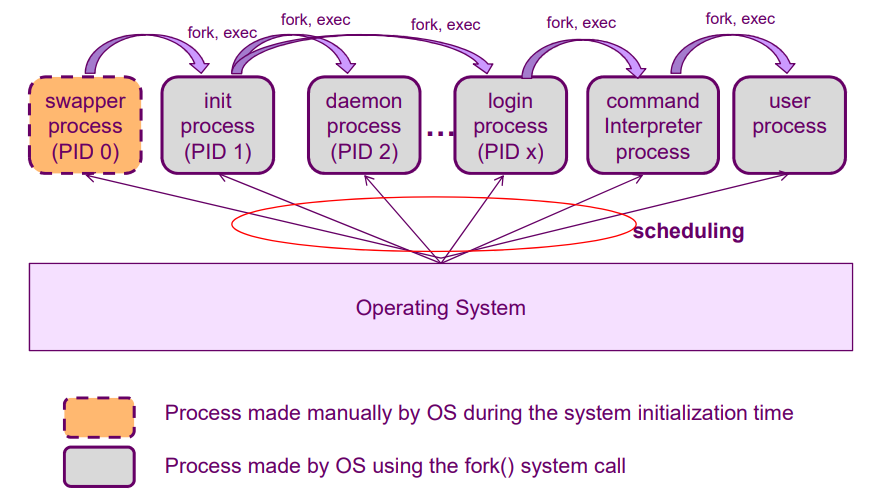 CPU는 운영체제 코드를 실행하는데, 운영체제 코드는 pid가 0이며 모든 프로세스의 시조인 swapper process를 만든다. (idle process)