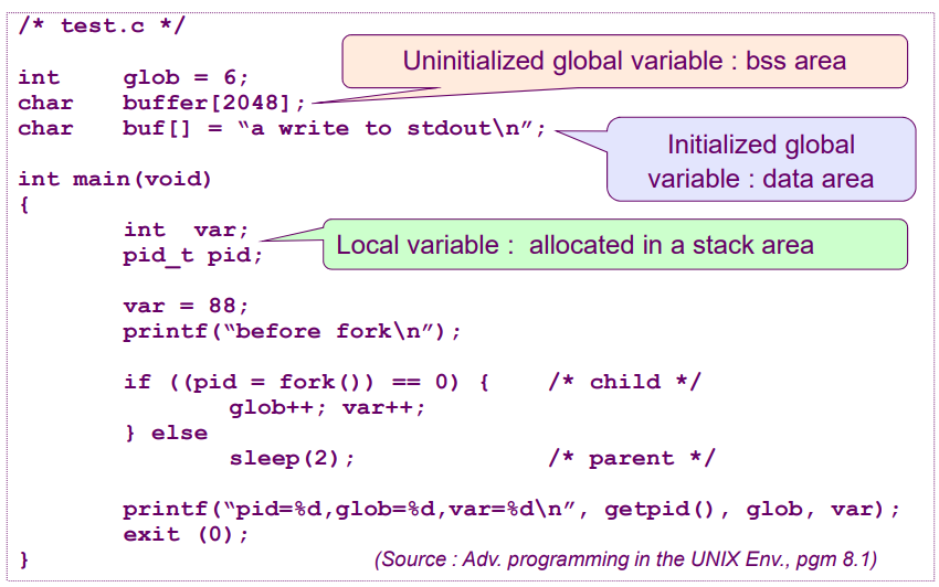 자식 프로세스는 fork 시스템 콜을 실행하지 않았고, pid값은 기본 값인 0으로 초기화 되어 있으니 자식 프로세스는 glob++와 var++ 문장을 수행하게 된다. (이 때 변수는 자식 프로세스의 변수를 가리킨다)