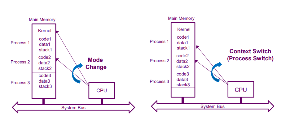 Mode Change는 같은 실행환경 내에서 유저 모드로 실행할지, 커널 모드로 실행할지를 의미하고