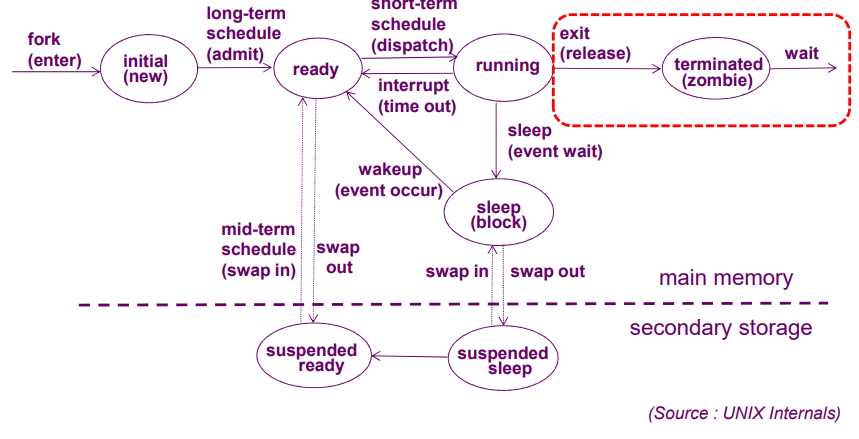 terminated 상태인 프로세스는 아직 제거된 상태는 아니고, wait System Call이 호출될 때 제거된다.