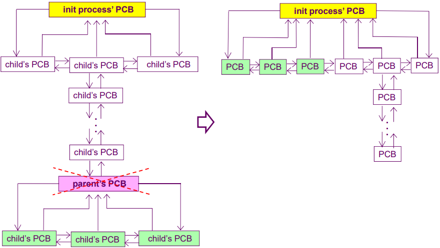 리눅스에서는 termintate 되는 프로세스가 자식 프로세스를 가지는 경우 남겨진 자식 프로세스는 init 프로세스의 자식이 된다.