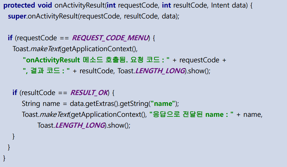 startActivityForResult메서드를 사용해 액티비티를 띄울 때 요청 코드인 REQUEST_CODE_MENU와 intent객체를 이용해 값을 받아와 처리한다.