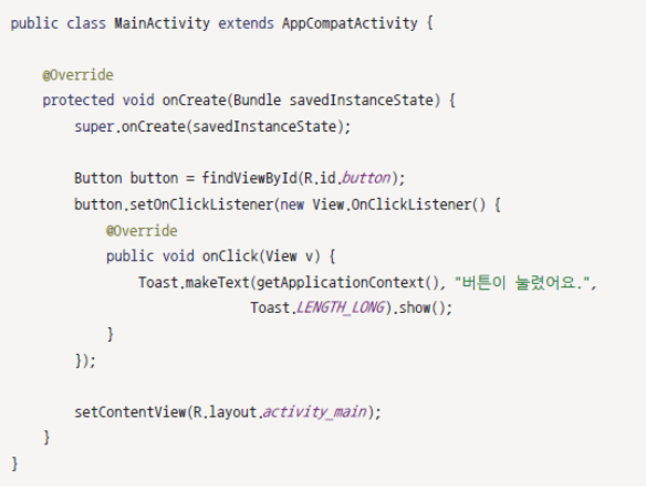 setContentView 메서드를 먼저 수행한 후에 버튼을 생성하거나, 이벤트 처리 코드를 작성하거나 해야 한다.