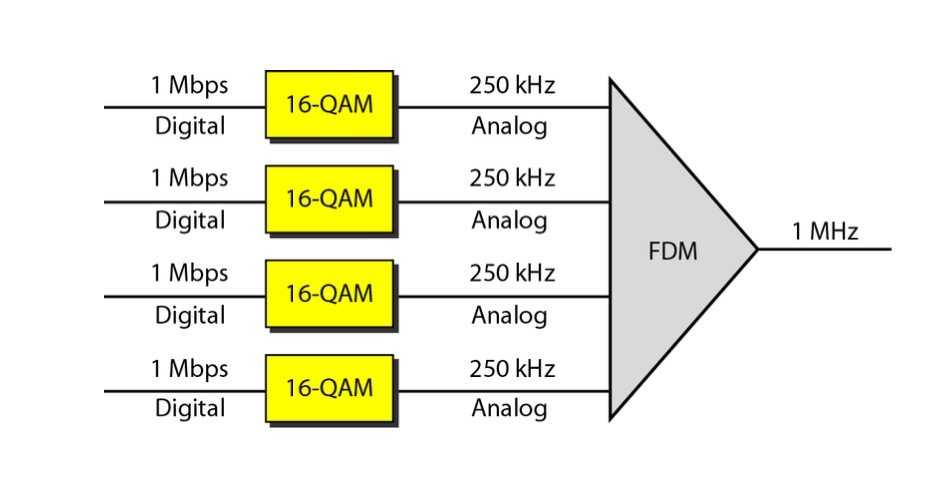1MHz 대역폭을 4개의 채널로 쪼갠다고 생각해보자. 채널 한개당 250KHz 주파수를 가지게 된다.