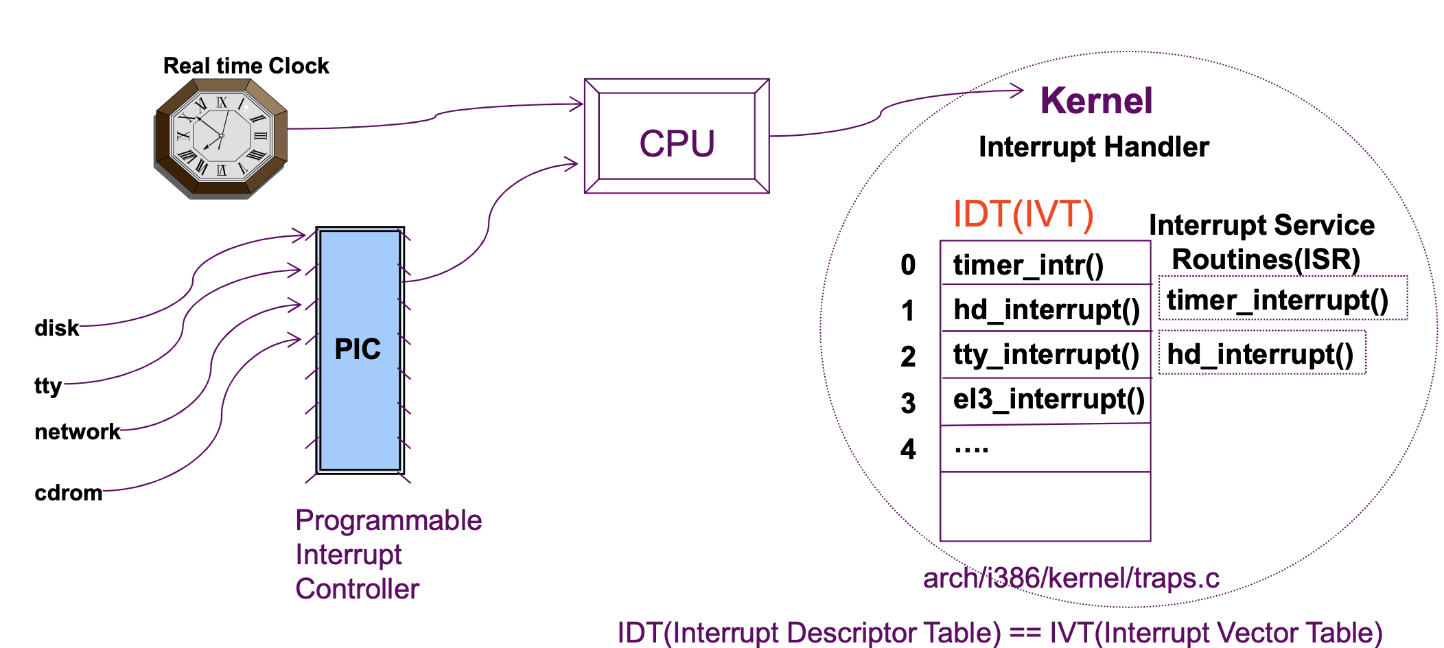 리눅스에서 Clock Interrupt는 1ms마다 걸리고, 그 때 마다 Interrupt Handler가 Interrupt Service Routines의 0번 주소인 timer_intr() 함수를 실행한다.
