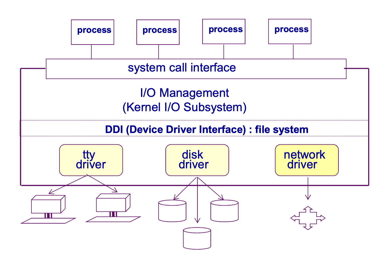 응용 프로그램은 시스템 콜을 보내고.. OS의 I/O Management를 담당하는 부분이 해당 요청을 받고 어떤 장치를 통해 입출력이 처리되는지 파악한다.