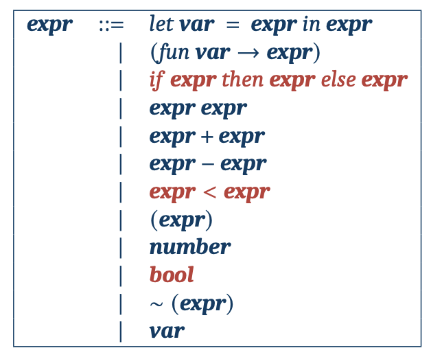 기존 언어에서 if - then - else 을 추가하고, 크기 비교 연산자와 논리값을 추가하자.