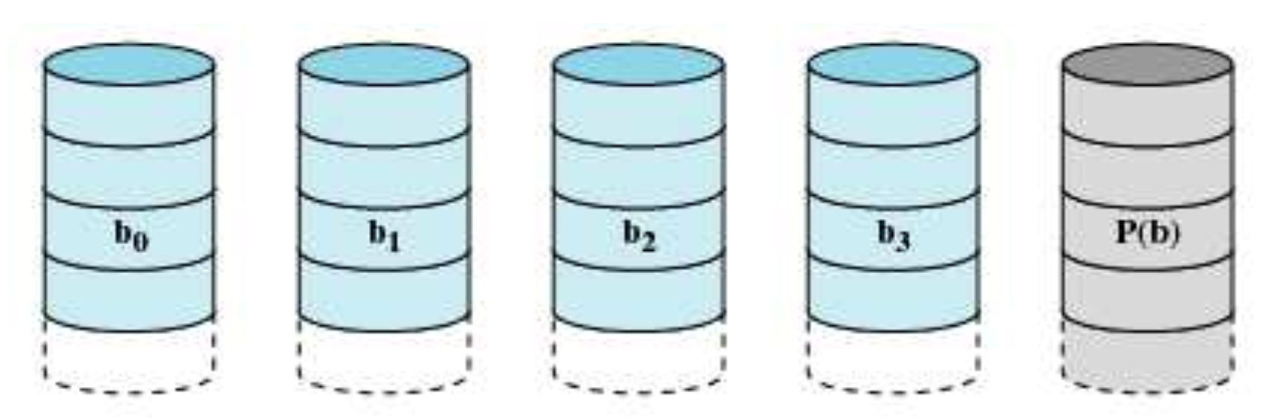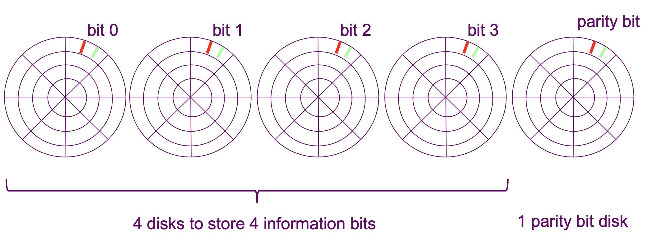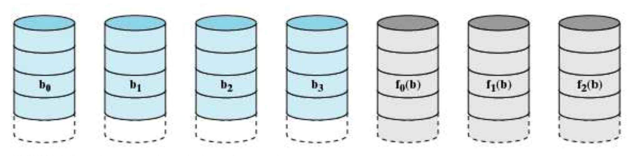 이렇게 저장하면 디스크 하나가 고장나더라도 각 파일의 1/4 만 잃어버리게 되고, 나머지 내용을 보고 손실된 내용을 일부 복원할 수 있다.