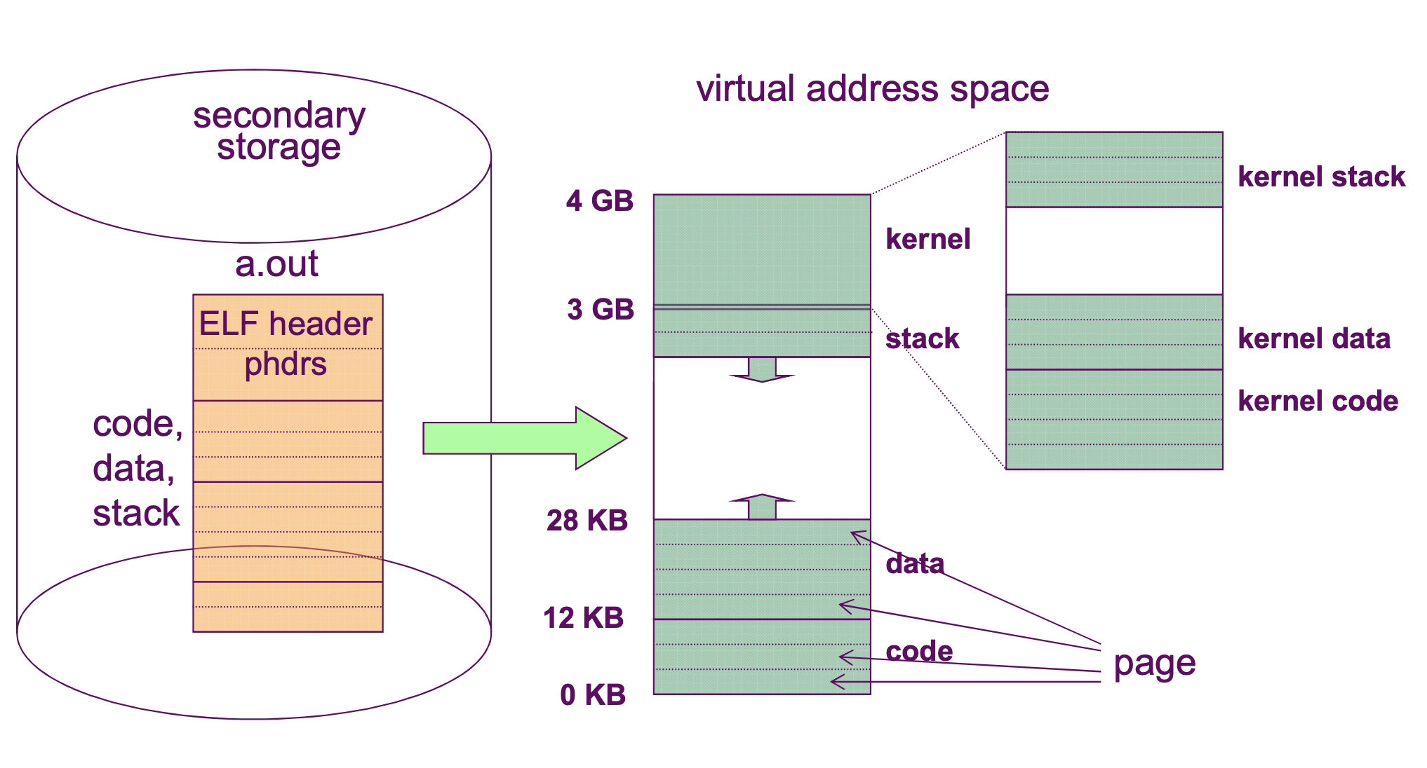 C프로그램을 컴파일하면 실행 파일이 만들어지고, 실행 파일을 실행시키면 보조 기억 장치에 Virtual Address가 만들어진다.