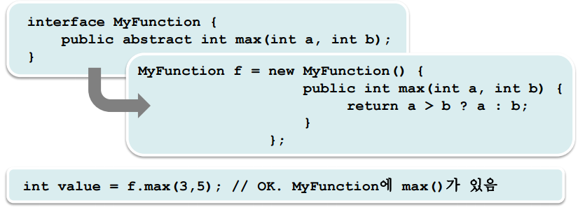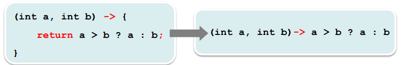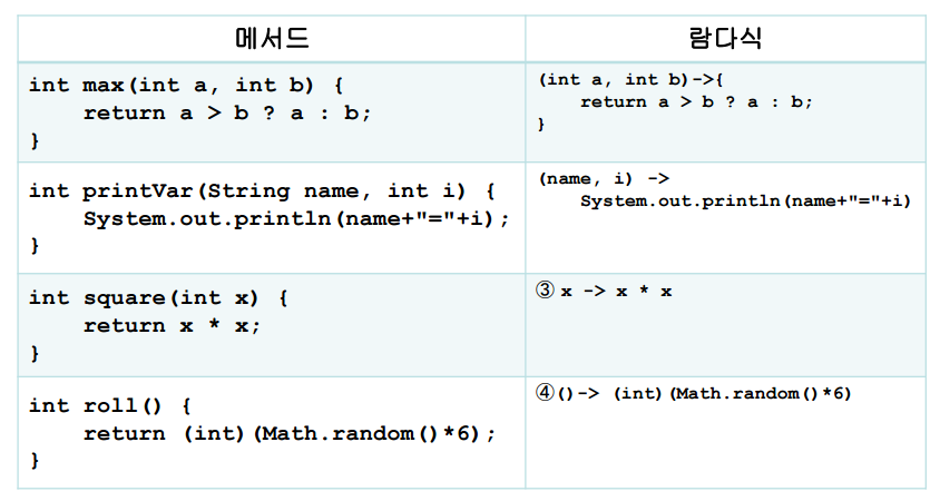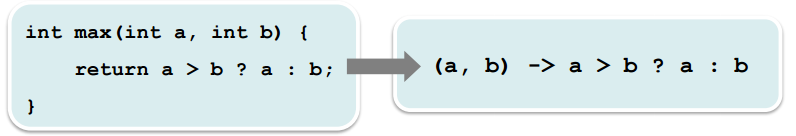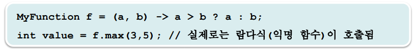 왼쪽 함수의 이름은 max이고, 이 함수를 람다식으로 변형하면 오른쪽처럼 이름 없는 함수가 된다.