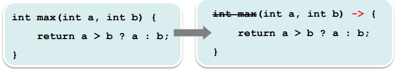 1. 메서드의 이름과 반환타입을 제거하고 ->를 {} 앞에 추가한다. (반환타입을 안붙여도 컴파일러가 알아서 해석함)