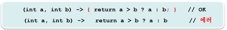 2. 문장이 한 줄 짜리면 {}를 생략할 수 있는데, 하나뿐인 문장이 return문이면 {}를 생략할 수 없다. (이 경우 ; 도 생략할 수 없음)