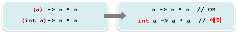 1. 매개변수가 하나이고 타입이 없는 경우에는 괄호 () 를 생략할 수 있다.