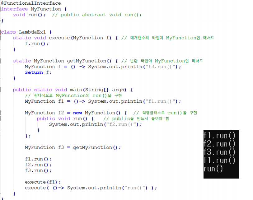 여기서 f는 어떤 클래스의 객체라고 볼 수 있지만, 여기서는 함수형 인터페이스이기 때문에 함수를 저장한 것으로 생각해 줄 수 있다. (함수를 저장하고 싶은데, 그게 안되니까 추상메서드 하나 선언된 인터페이스를 함수로 봄)